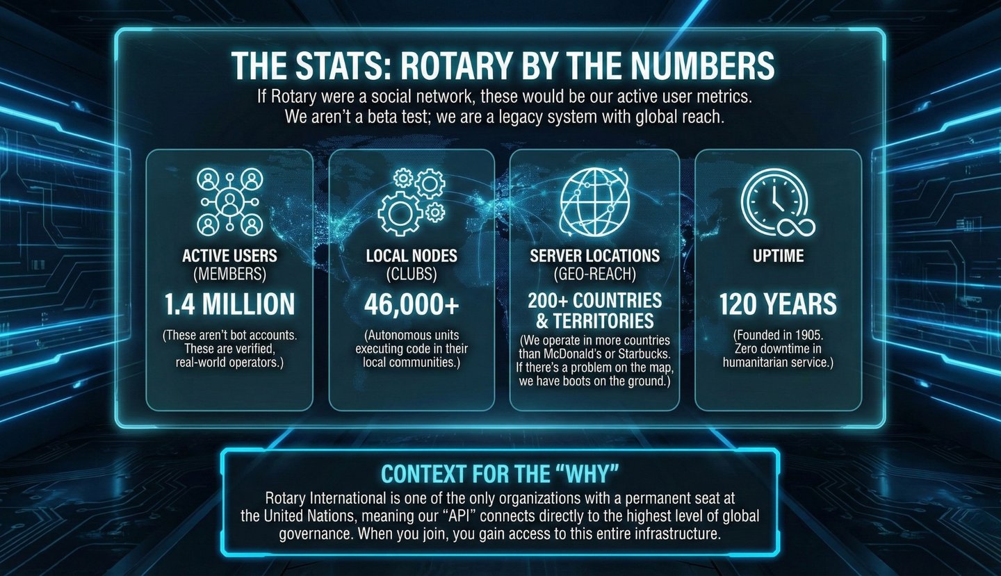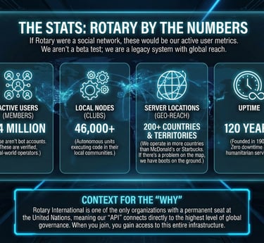 The actual Rotary is the original decentralized network. We are a massive, global API for social change. While governments are buffering and corporations are stuck in endless meetings, Rotary is shipping updates. From debugging polio (99.9% patched) to deploying clean water infrastructure in the cloud of the real world, we are the only organization with the bandwidth to solve problems at scale.